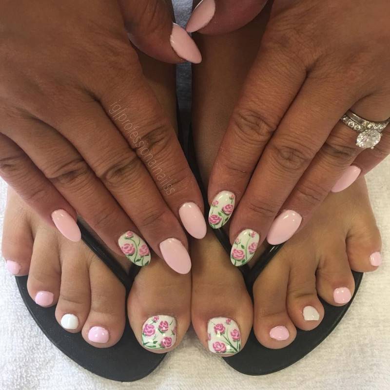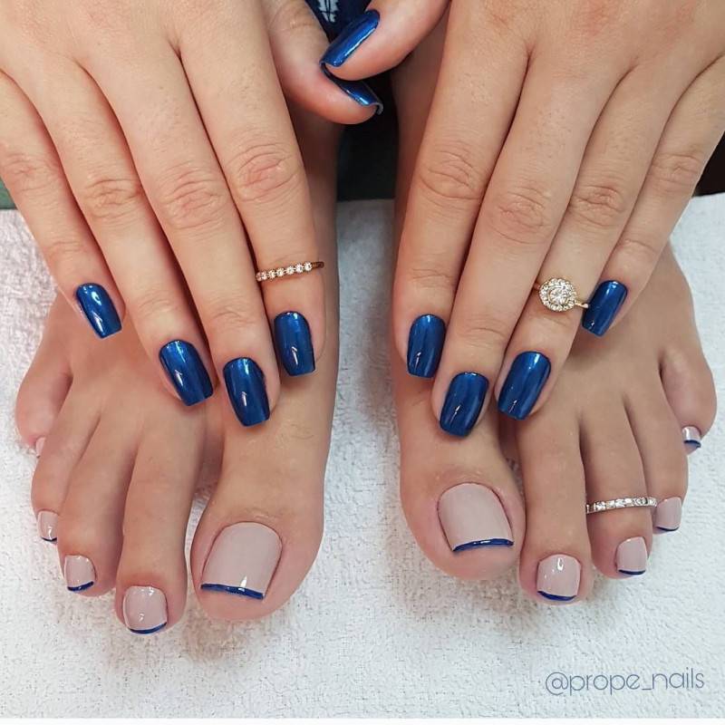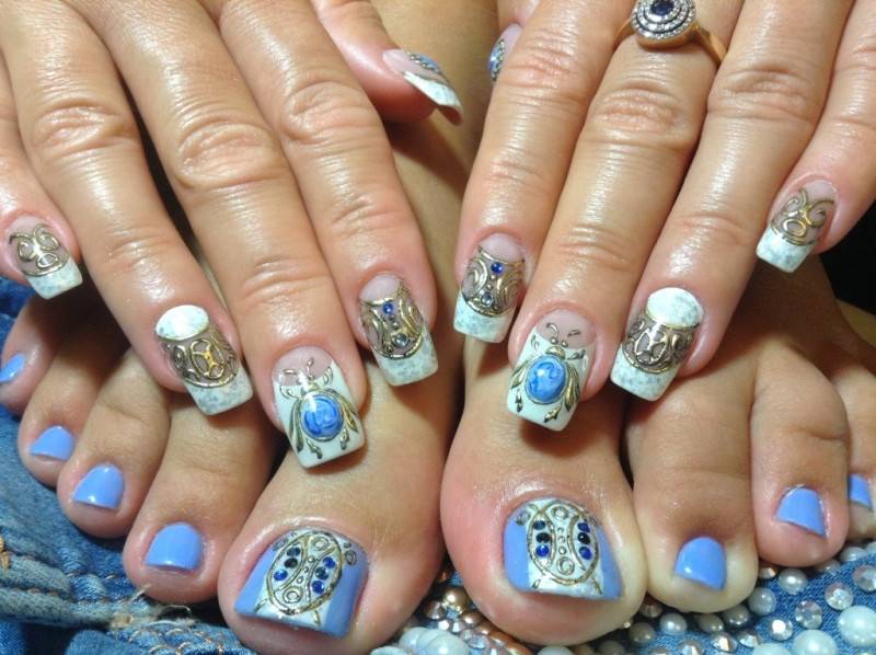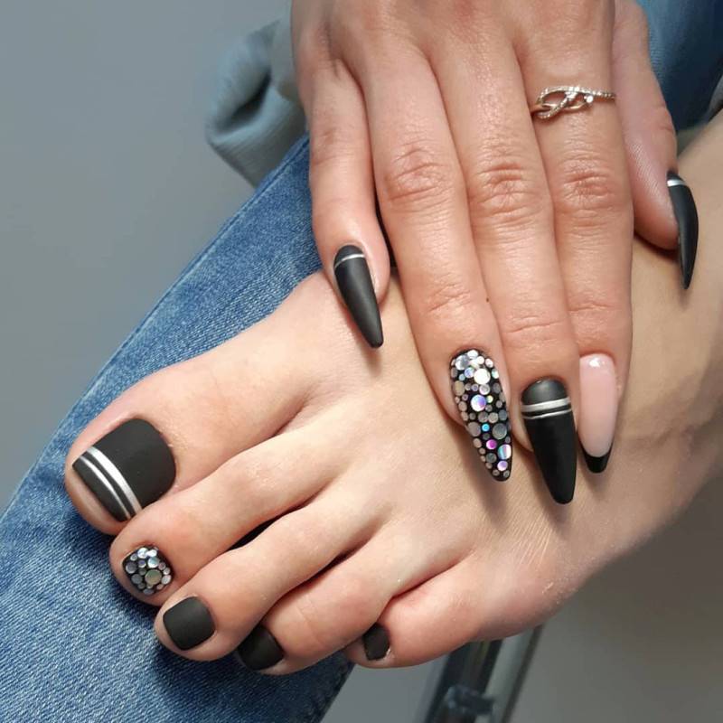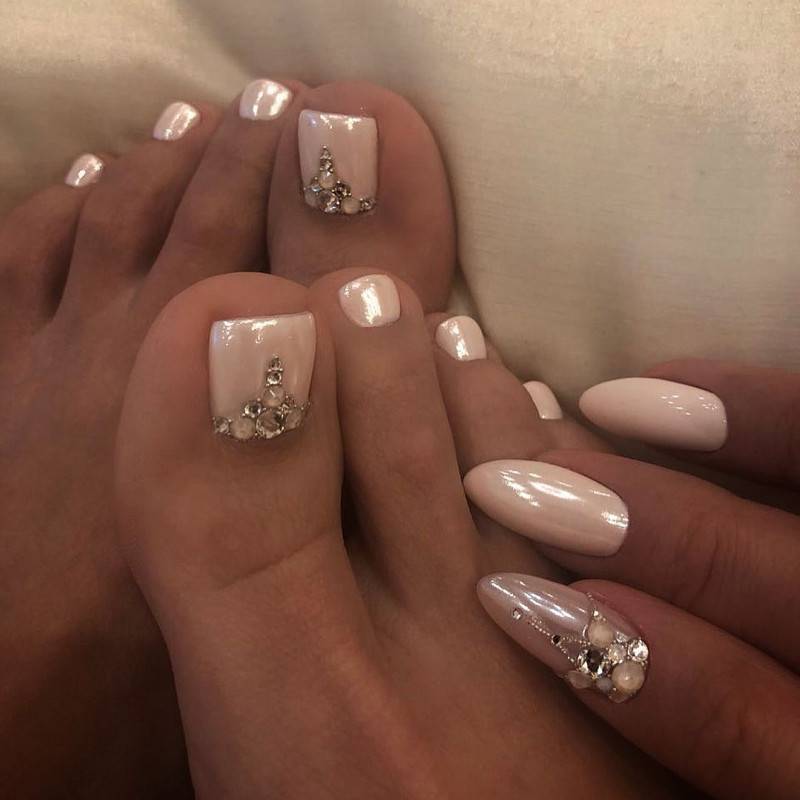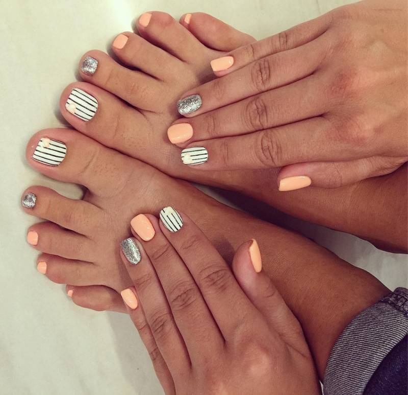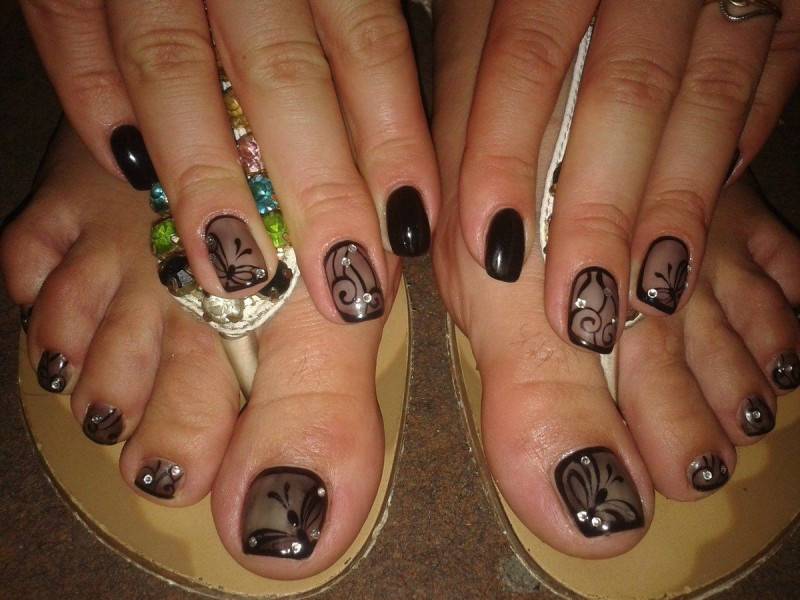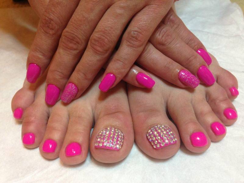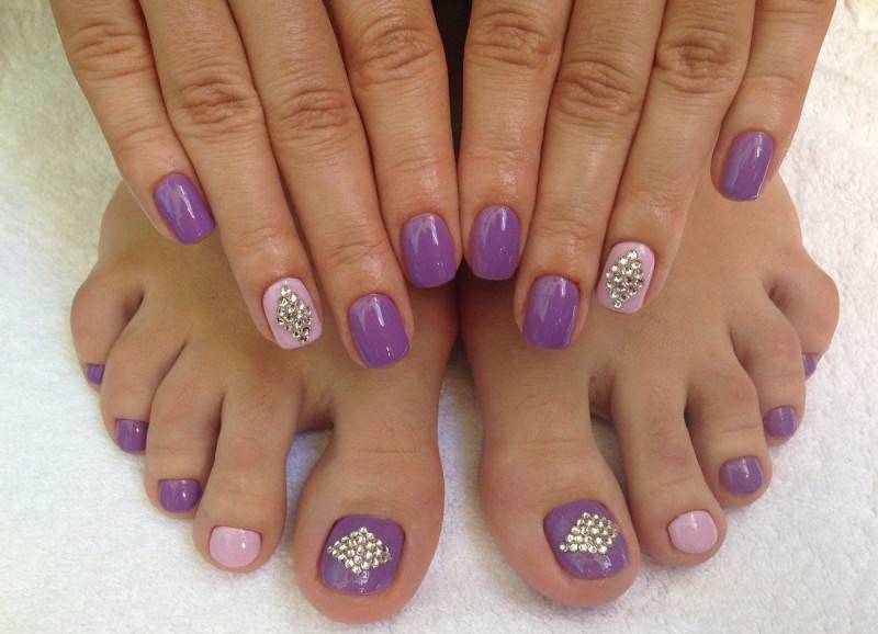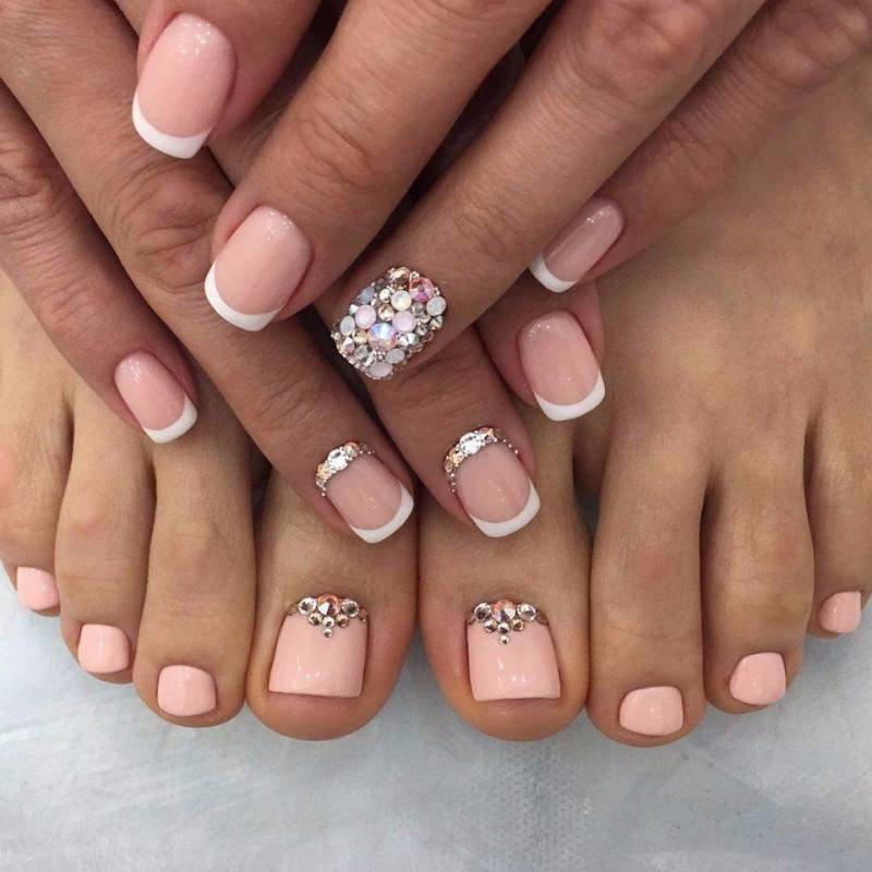 Многие барышни не представляют своего маникюра и педикюра без использования в дизайне блёсток или сверкающих декоративных украшений. Нейл-дизайнеры рекомендуют в таких случаях не отказывать себе любимой и немного поэкспериментировать с подобными идеями. Чтобы создать более лаконичный, но блестящий дизайн, можно использовать в маникюре-педикюре один из видов втирки. Не менее красиво смотрятся выделенные блёстками глиттера или узорами из страз акцентные ноготки на больших пальцах ног и ноготки на безымянных пальцах рук. Расположение декора при этом не обязательно должно дублироваться. Также можно использовать декоративные украшения лишь для оформления маникюра. Для педикюра в этом варианте следует присмотреть лаконичное оформление с использованием таких же оттенков лака.