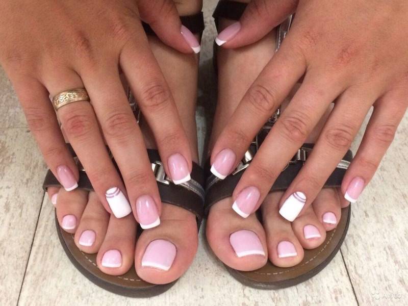 Французский дизайн считается незаменимой классикой, которая способна невероятно перевоплощаться и дополнять любой женский образ. Оформление этой идеи в летнем маникюре-педикюре для сезона 2020 предоставляет модницам абсолютную свободу при выборе оттенков и формы улыбки. Помимо классического белого кончика ногтевых пластин, линия улыбки может оформляться любым другим цветом, как и основание, и быть двойной, в виде узоров или конверта, как вам больше нравится. Французский маникюр-педикюр также можно дополнительно освежить при помощи аккуратных рисунков на руках или ногах либо блестящими элементами декора.