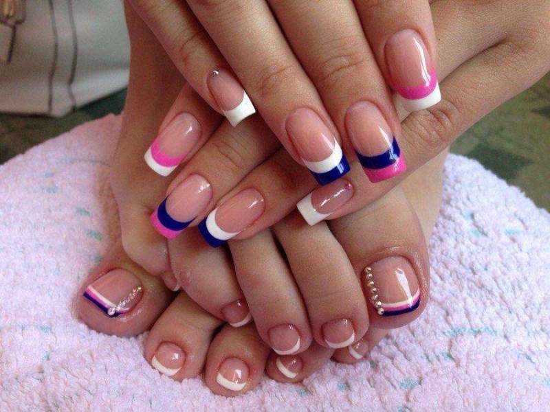 - Следующий этап — работа с гелем или акрилом. Наиболее часто мастер делает педикюр френч . Такие ноготки не обязательно красить дополнительно. Они выглядят очень аккуратно и подходят практически под любой гардероб или образ. Искусственные ногти акрилом делаются в один слой, в то время как гелевое покрытие состоит из нескольких слоев, каждый из которых сушится отдельно с помощью УФ лампы.