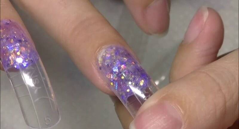 Пальцы с накладными типсами помещают под УФ лампу примерно на пять минут и ждут когда материал полимеризуется. Производители указывают на упаковке, сколько требуется времени для затвердения материала