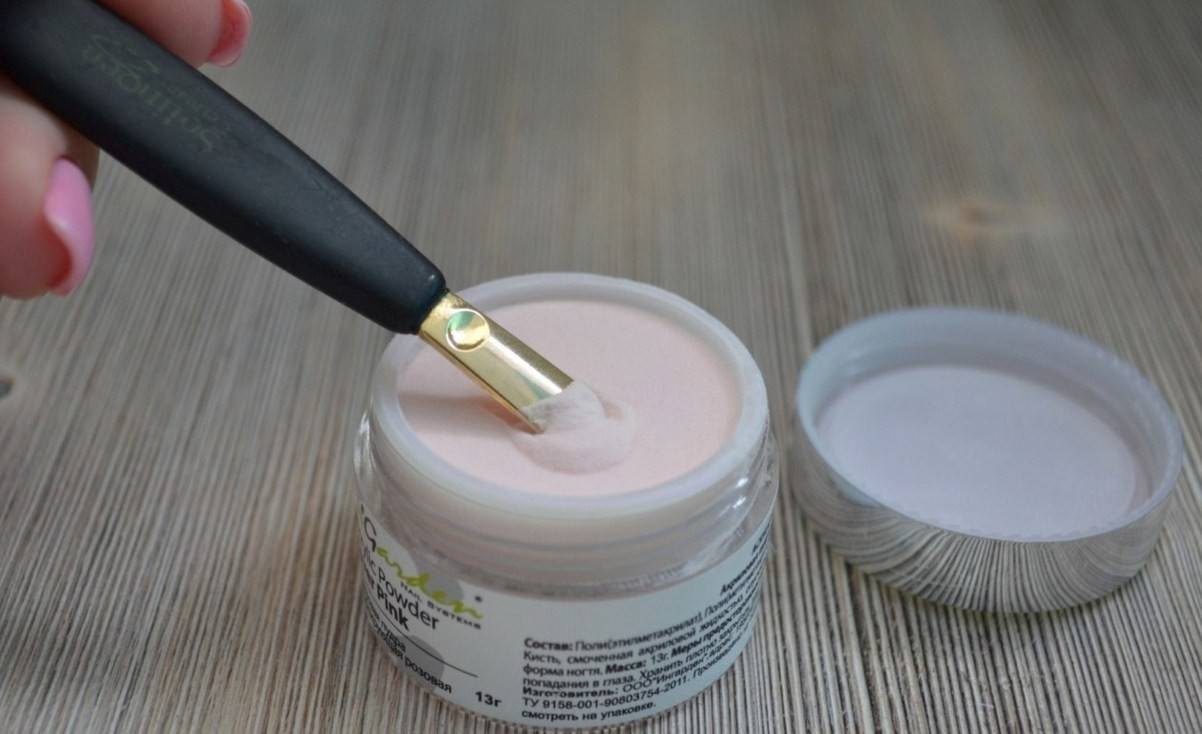 Акриловая масса на приклеиваемые типсы наносится непосредственно после закрепления типсы на ногтевой пластине. А состоит она из акрилового порошка тонкого помола (пудры) и ликвида-мономера.
