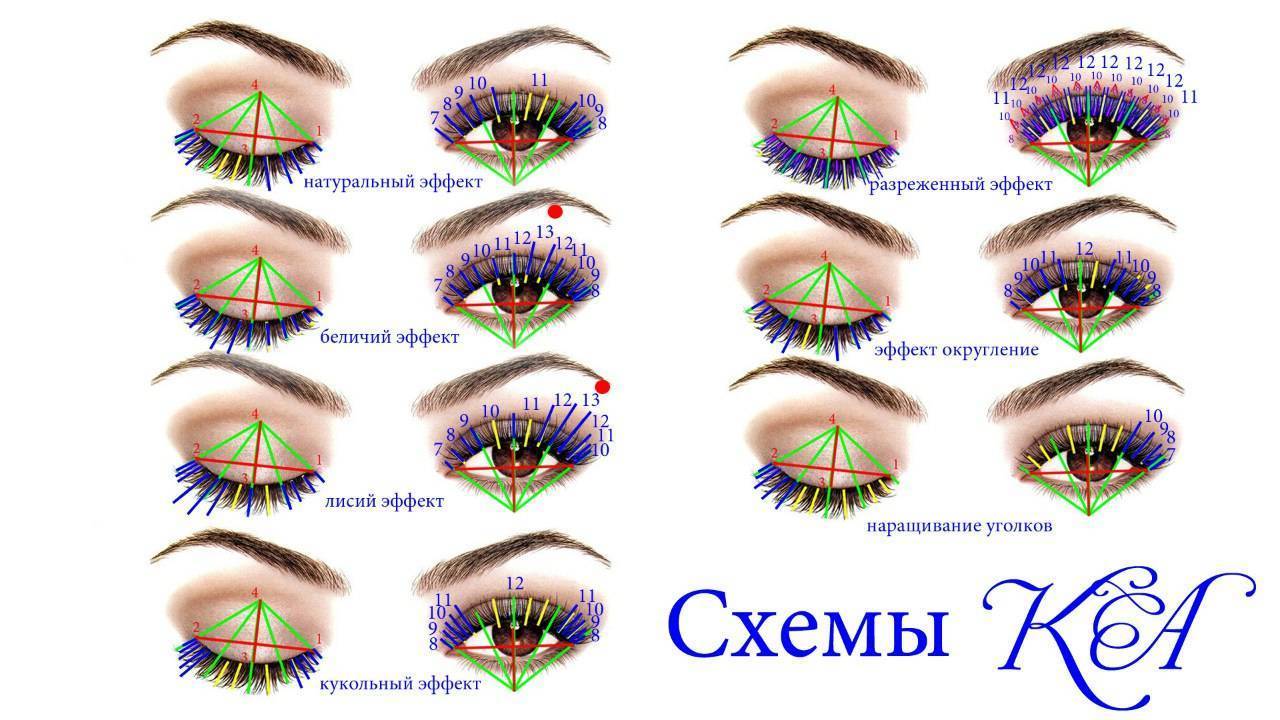 Ресницы на веке растут рядами (на верхнем веке – в 3-4 ряда), поэтому, для равномерного наращивания, мастер сначала пройдет один ряд полностью, затем второй и так далее, создавая желаемый d-эффект. Для этого он будет использовать соответствующие картинки-схемы.