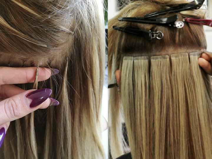 - Приклейте ленту по линии пробора на расстоянии 1–2 см от корней и зафиксируйте на ней накладные пряди.