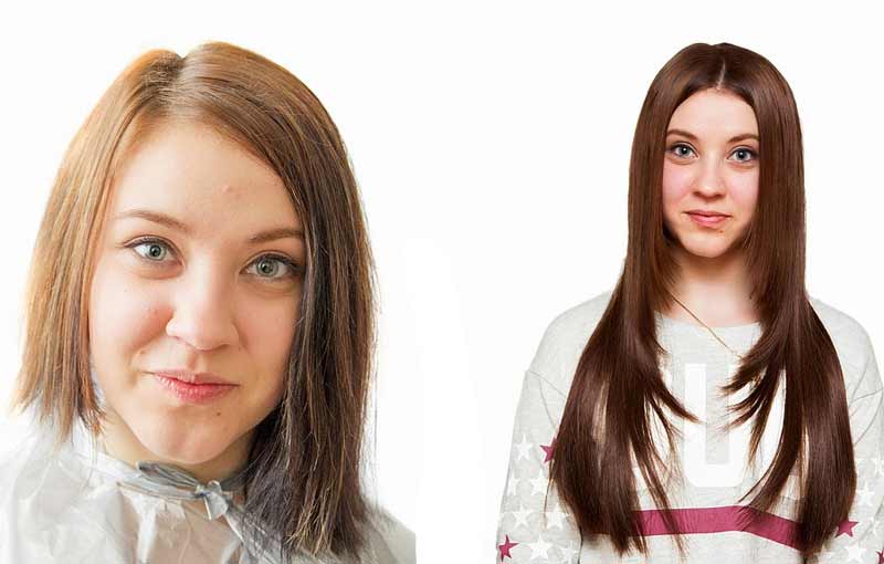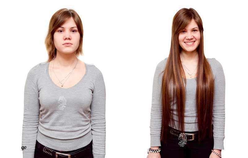 Дополнительные пряди безболезненно добавляются путем закрепления на косичках. Очень щадящая методика дает значительный объем даже на очень редких локонах.