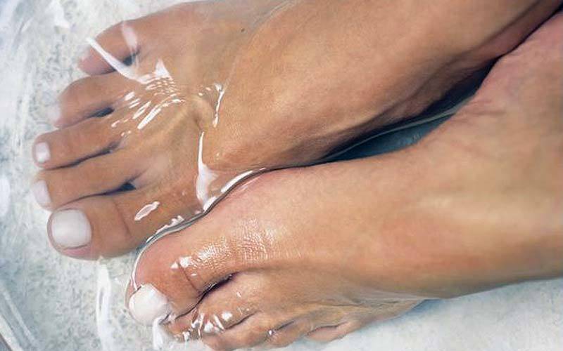 Можно выполнять ножные (или ручные) ванночки. Наливают в миску горячую воду и растворяют «Доместос», рассчитывая, что потребуется 1 ст. л. средства на 5 л жидкости. Продолжительность сеанса 25-30 минут. Проводят их через день.