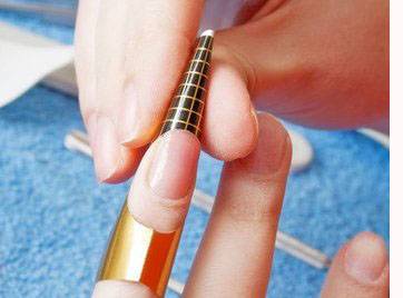 - Подготовив ноготь, закрепите на пальце форму для наращивания.
