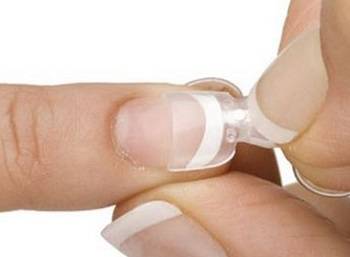 - На типсах. В процедуре наращивания можно использовать два вид типсов: обычные типсы, чтобы потом формировать французскую улыбку поверх них, либо типсы-френч, на которых уже прорисован белый край. Останется лишь прикрепить их к своему ногтю и покрыть соответствующими средствами, следуя правилам наращивания.