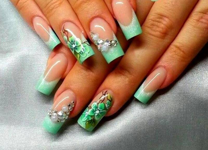 Краешек ногтя делается большим и украшается различными дополнительными материалами. Для украшений берется искусственный жемчуг, бусинки, стразы или фигурки из полимерной глины.