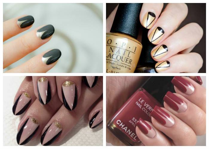 Тем, кто любит нестандартные формы, можно предложить оформить кончик в треугольной форме, в форме волны или косой линии. Также можно сделать не одну каемку кончика ногтя, а две.