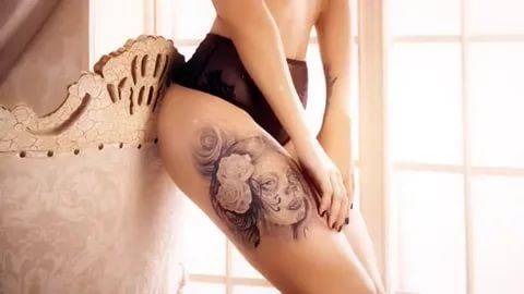 Самой большой и яркой тату Насти Ивлевой является изображение Леди Катрины в стиле «Чикано» на ее бедре.