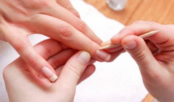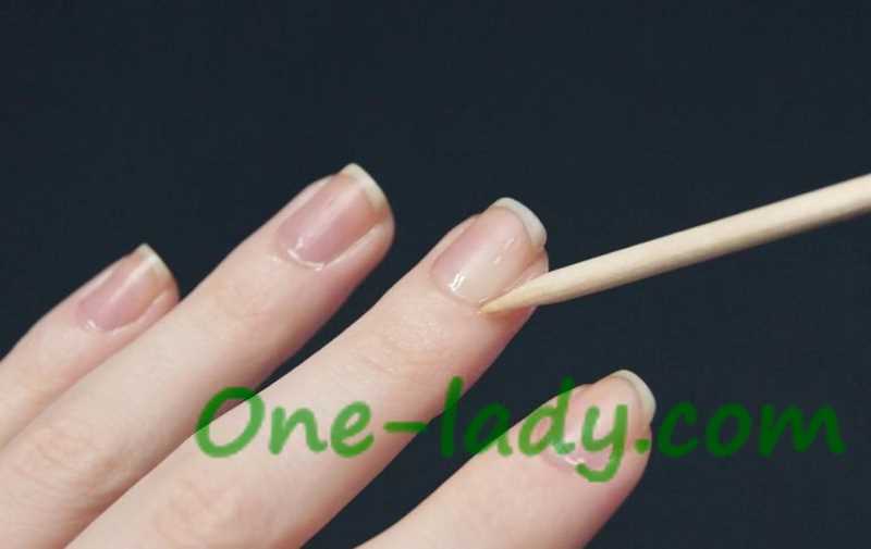 Спустя время кутикулу можно либо счистить, или же отодвинуть с помощью апельсиновой палочки. В то же время нельзя забывать, что обработке должны подлежать и боковые валики.