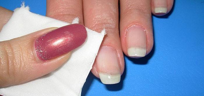 - Сначала, как правило, и в классическом и европейском маникюре мы удаляем старый лак с наших ногтей. Маленькая хитрость: удаляем лак правильно. Для этого надо нанести на ватный тампон чуть-чуть жидкости для лака, прижать его на несколько секунд к ногтю, и после одним быстрым движением руки удалить лак.