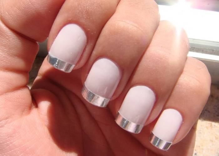 Принцип этого нейл-арта: на кончик ногтя поверх нейтрального основного лака наносится фольга или плотное покрытие с блестками.