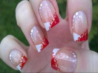 Красный френч или френч с элементами красного создает уникальный дизайн маникюра. Он страстный, яркий и необычайно притягательный. Красный красиво сочетается с черным, белым, золотом, серебром, фиолетовым, желтым и зеленым. Мастера часто используют его для создания рисунков цветов, которые могут быть переходящими.