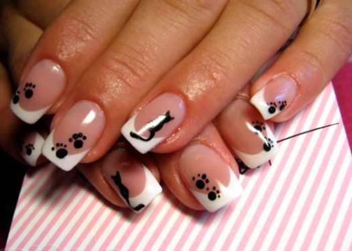 Еще один популярный вид “звериного” френча выполняется следующим образом: сначала делается классический дизайн. После высыхания покрытия в стилизованной форме рисуем на одном ноготке котов, а на краях ноготков – следы лапок. Такой нейл-арт игриво смотрится и просто выполняется.