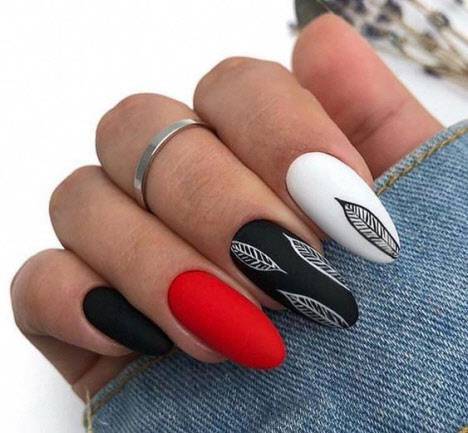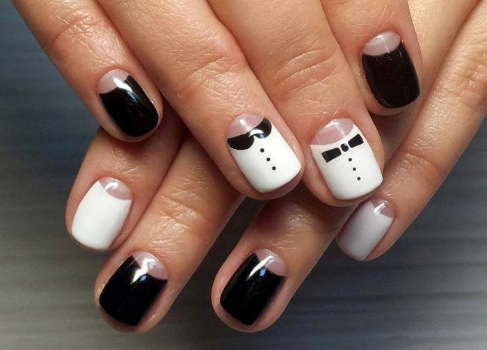 - Оригинальный. Здесь покрытие может осуществляться разными цветами. К примеру, между собой могут комбинироваться красны и черный, синий и белый. Иногда безымянные или средние пальцы дополняются узором, контрастирующим с основным оттенком ногтевых пластин;