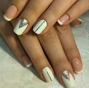 Как уже говорилось выше, классический френч – это база, поэтому можно смело дополнять ее различными рисунками. К примеру, геометрический дизайн часто бывает насыщенным, дерзким. В данном случае это неприемлемо, ведь намного более интересно будут смотреться легкие минималистичные линии или фигуры. Такое сочетание – прекрасное решение даже для повседневной жизни.