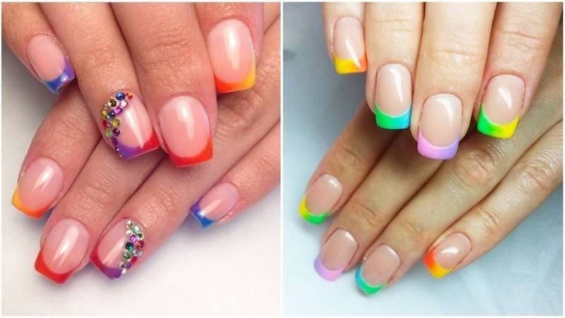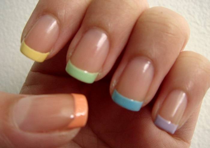 Достаточно заменить белую полоску на кончиках на яркую расцветку. Неоновая каемка желтого, синего, красного и розового цвета отлично будет сочетаться с пастельными тонами. При создании композиции можно использовать одновременно несколько типов лака: яркий, блестящий и нежный нюдовый цвет.