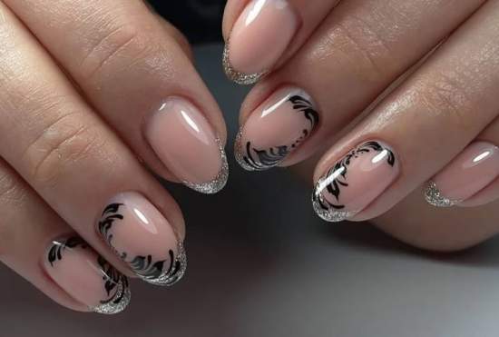 Если вам нужно нечто особенное, на важное мероприятие в вашей жизни, то лучше подобрать френч с дизайном. В подобном виде продумано все: от подбора базы под лаки, вплоть до верхнего финишного слоя. Здесь могут быть задействованы сложные, переходящие рисунки, множество декора, не один цвета лака, техника обмре или градиент