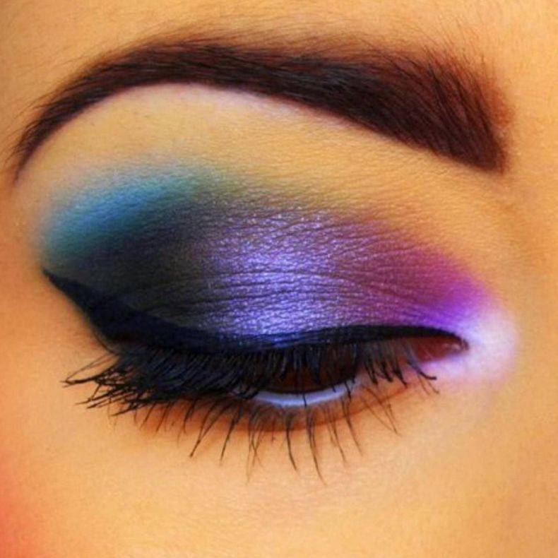 Попробуйте соединить на веках триколор в виде синего, жёлтого и зелёного или создать чёткую границу между изумрудным и голубым оттенком, не все решаться на такой смелый эксперимент и поэтому это будет выглядеть незабываемо. Придётся, конечно, немного привыкнуть к своему новому образу, но оно того стоит.