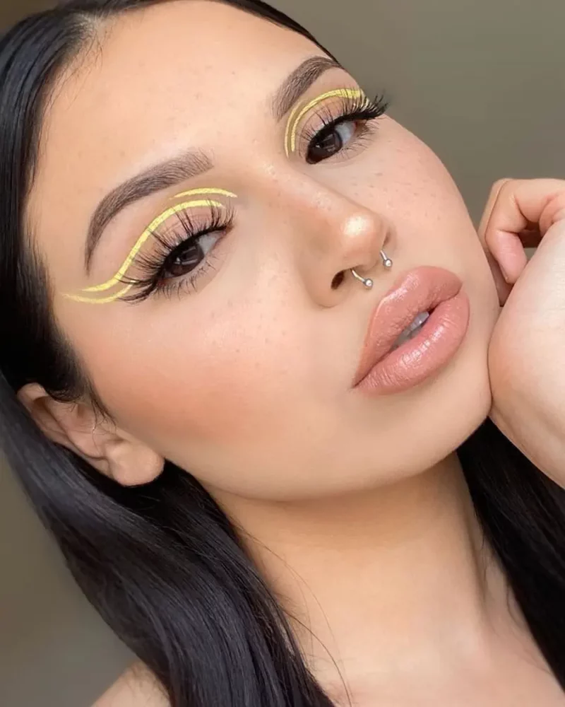 Если не готовы к слишком смелому образу, то нарисуйте на верхнем веке двойную подводку чуть выше уровня ресниц чёрным цветом. Можно дать волю фантазии и создать на глазах небольшие плавные линии или вывести «лисий глаз», что сделает образ загадочным и притягательным.