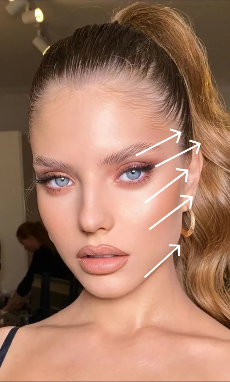 - самая выступающая точка на лице – это обычно скуловая кость, здесь наносится хайлайтер, который придает коже здоровый блеск и сияние, его также наносят по линии, уходящей к уху;