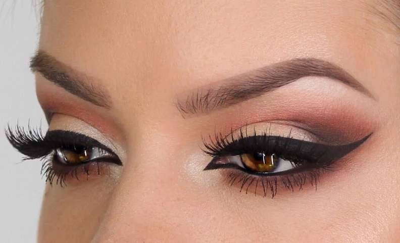 Выбор стиля для макияжа глаз – ответственный момент. Можно остановиться на ставшим уже классикой смоки либо создать стрелки «аля кошачий глаз». Для более выразительного взгляда используют накладные ресницы.