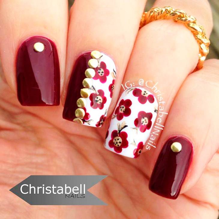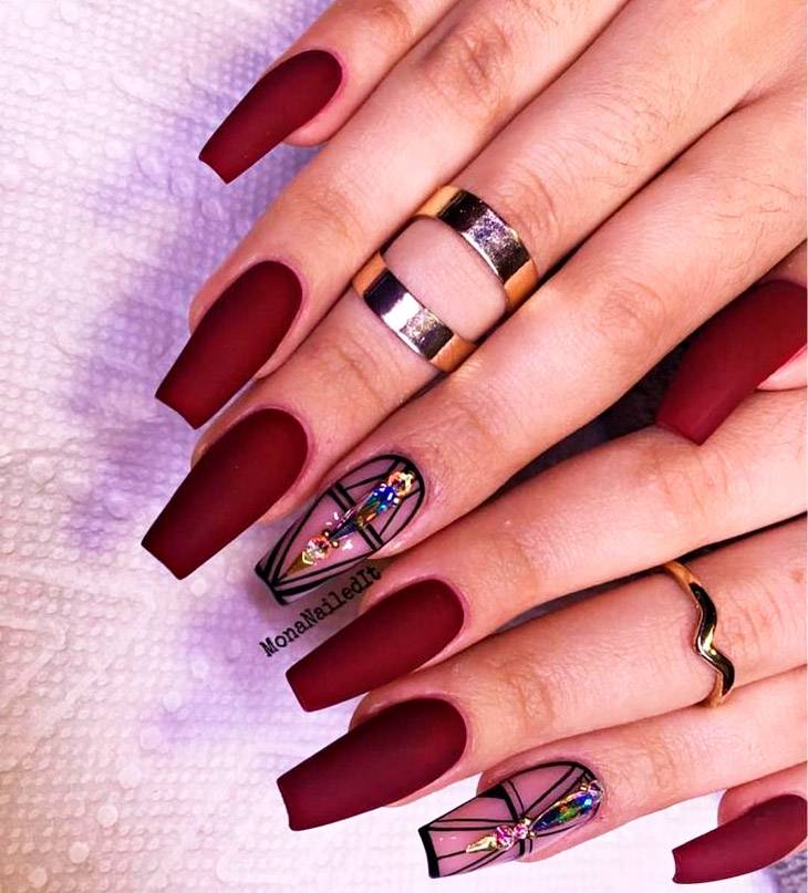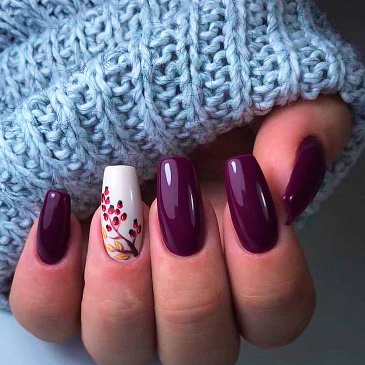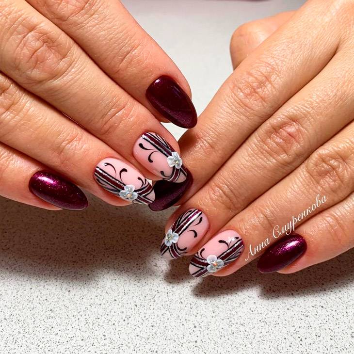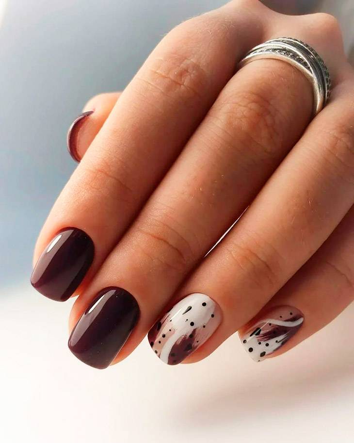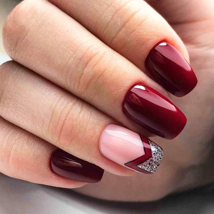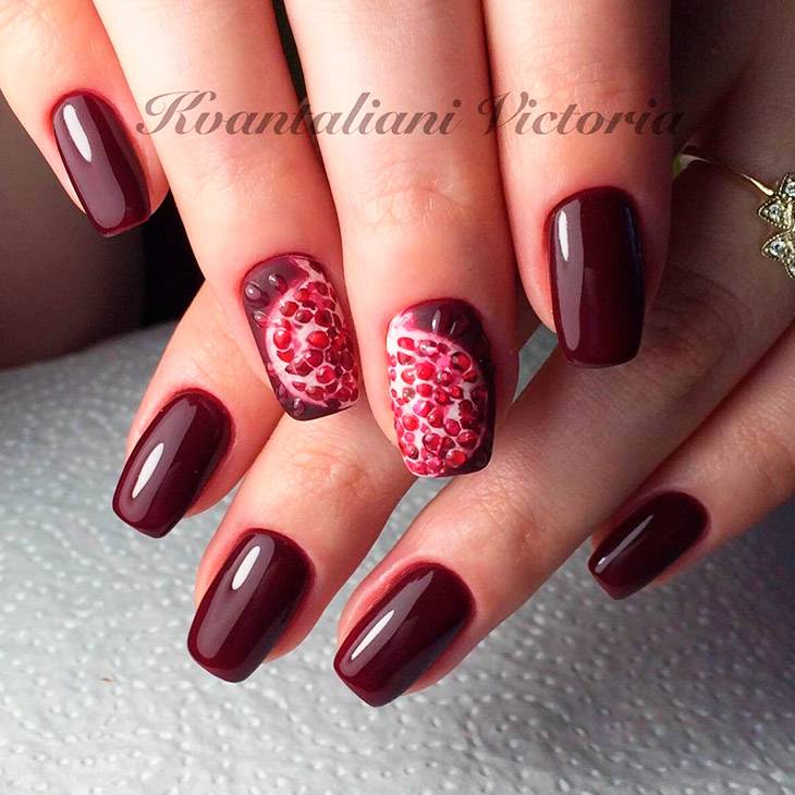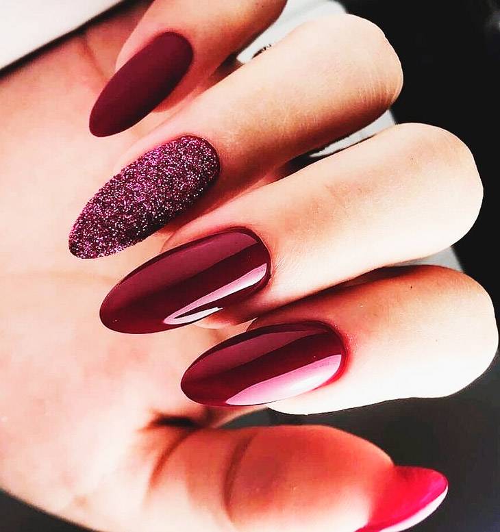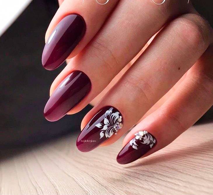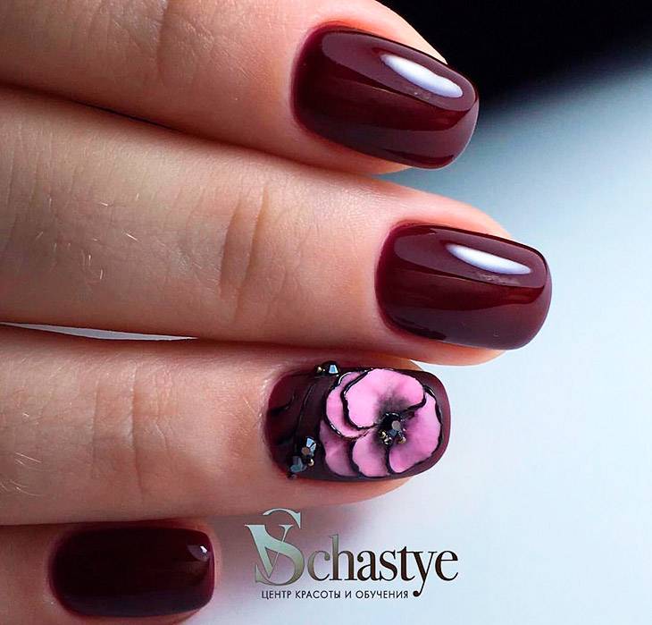 Популярен в 2023 году в виде минимализма. Бордовый, винный и вишневый актуален с длинными и короткими ногтями.
