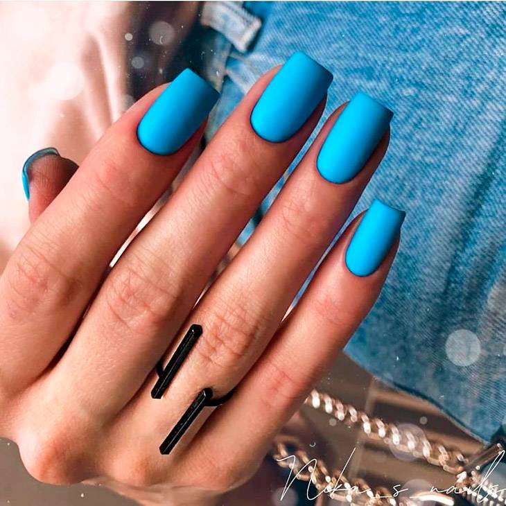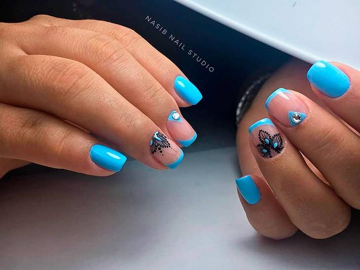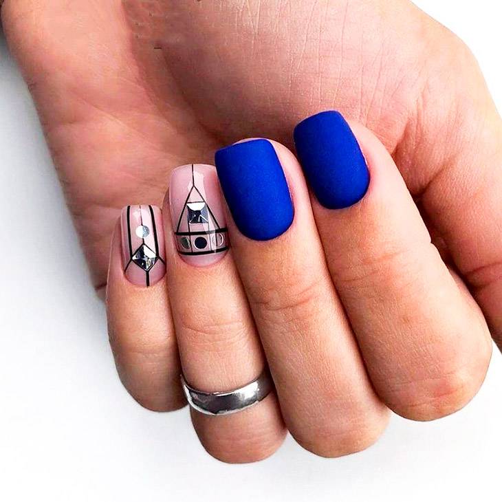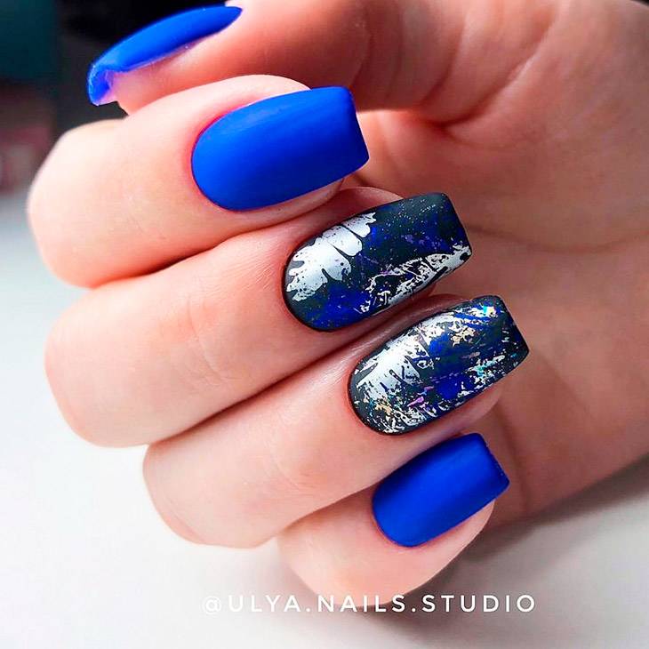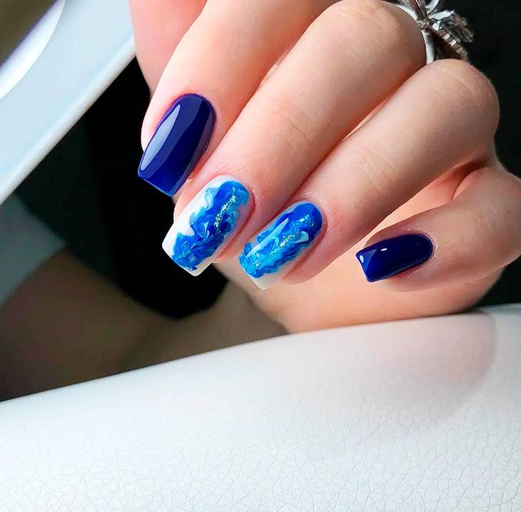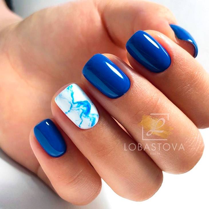 Самый глубокий цвет, комбинируется с белым тоном. Синий оригинально смотрится в маникюре с красным и чёрным. Светло-серый и синий подойдёт для будней и официальных торжеств.