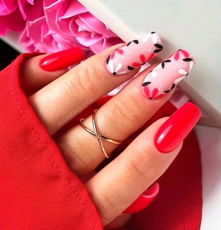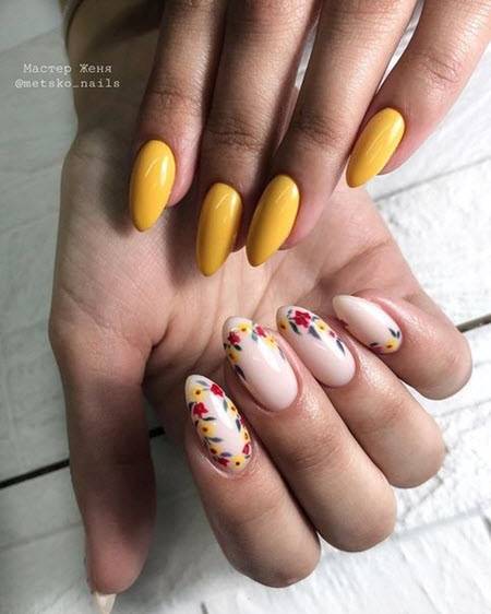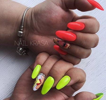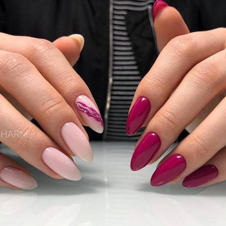 Одним из самых модных видов дизайна маникюра сезона 2021 есть разноцветный маникюр, когда одна рука красится одним оттенком, а вторая — совсем другим оттенком, иногда еще даже добавляют рисунки на одну руку. Такой маникюр делается и в пастельных оттенках, и в темных, и даже в неоновых. Могут выбираться цвета разной насыщенности одной цветовой гаммы или абсолютно контрастные.