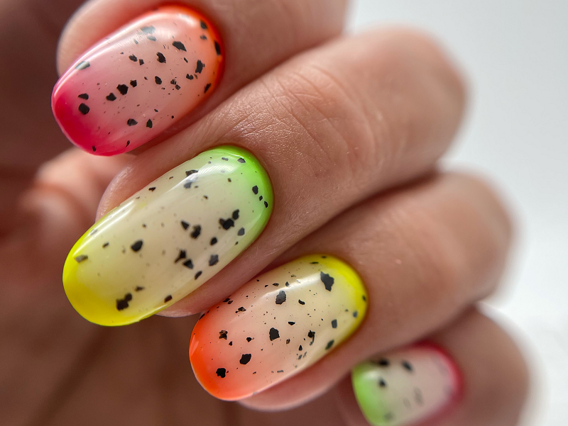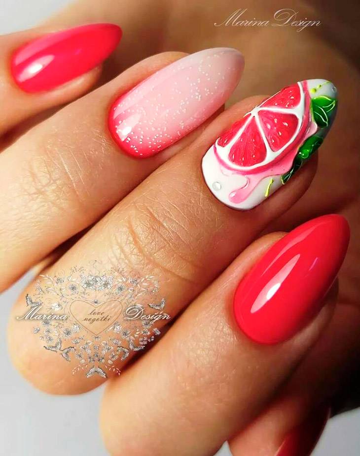 Сверху ногти покрывают серым, оранжевым и розовым гель-лаком. Для более яркого эффекта можно сверху нанести прозрачный блестящий слой.