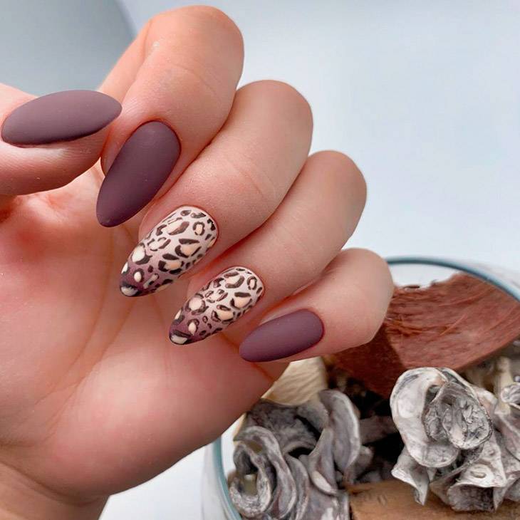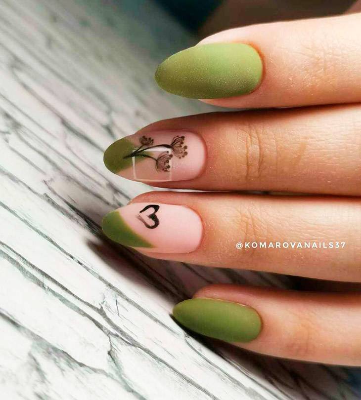 Оливковый – оригинальный цвет, сочетается с анималистическим дизайном, с повседневной одеждой. Может быть акцентом или дополнением в другом виде маникюра.