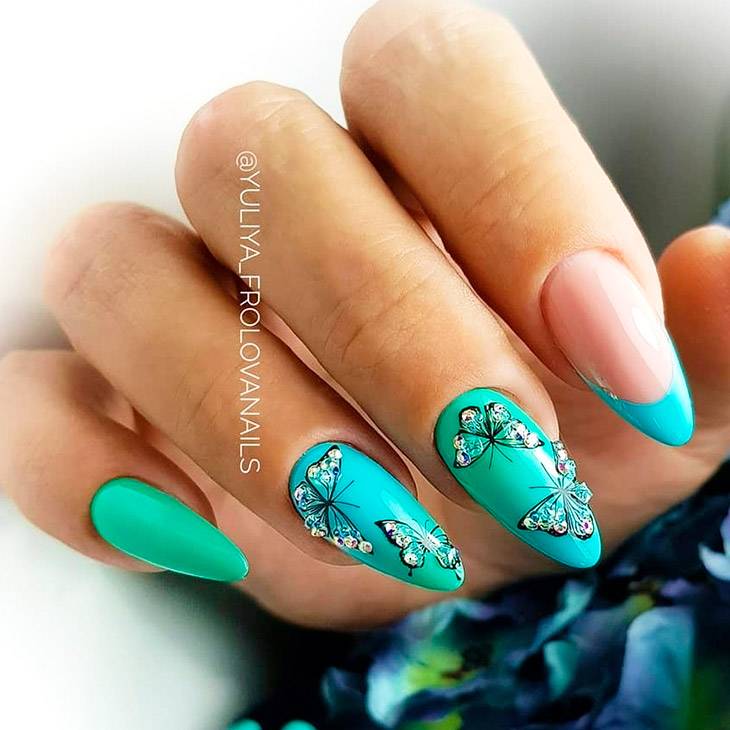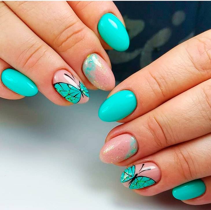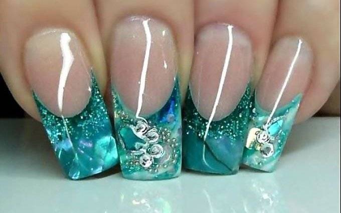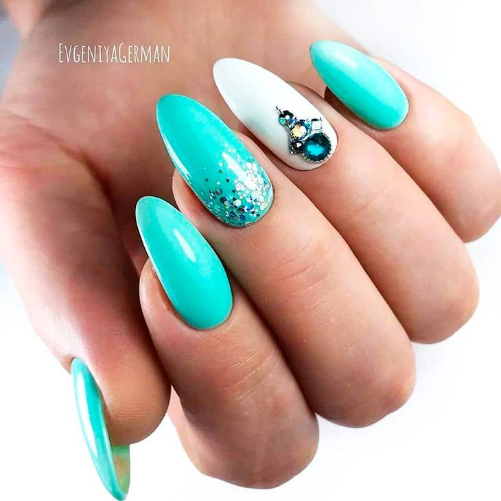 На сегодняшний день, бирюзовый цвет приобрёл популярность не только в маникюре. Он самый сдержанный и одновременно яркий. Сочетается с нежными обликами и украшениями.