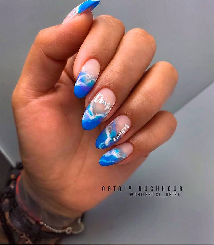 Часто используется в путешествиях. Морской цвет самодостаточный, но для придания единства, иногда выбирают светлые и розовые лаки.