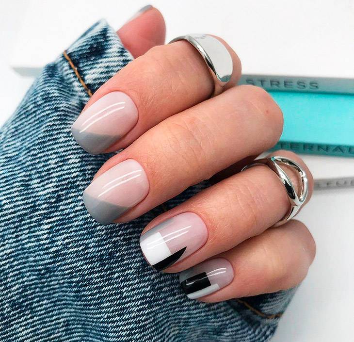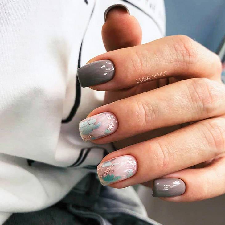 Прекрасная идея – украсить однотонный дизайн минималистичными рисунками, кусочками фольги. Форма мягкий квадрат более универсальна, смотрится нежно и хорошо сочетается с техникой градиента, с покрытием втиркой.