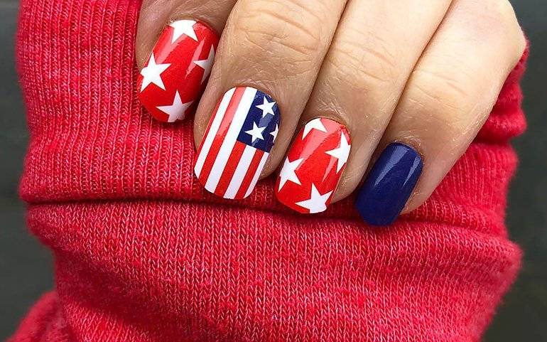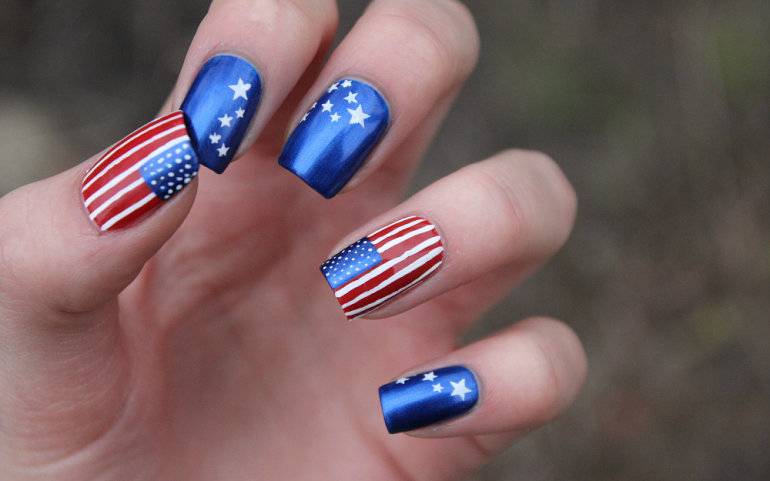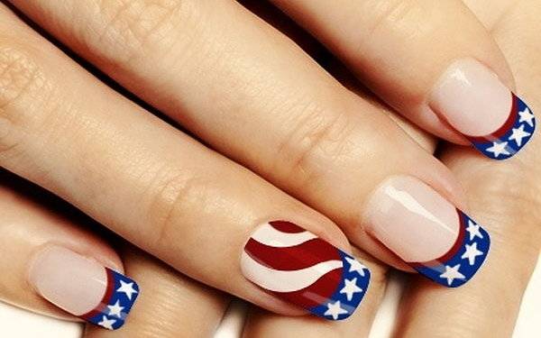 Синий, белый и красный цвета – беспроигрышное сочетание для оригинального, необычного маникюра. Дизайн американского флага популярен не только в стране свободы и демократии, но и по всему земному шару. Не отстают от модных тенденций и жительницы России.