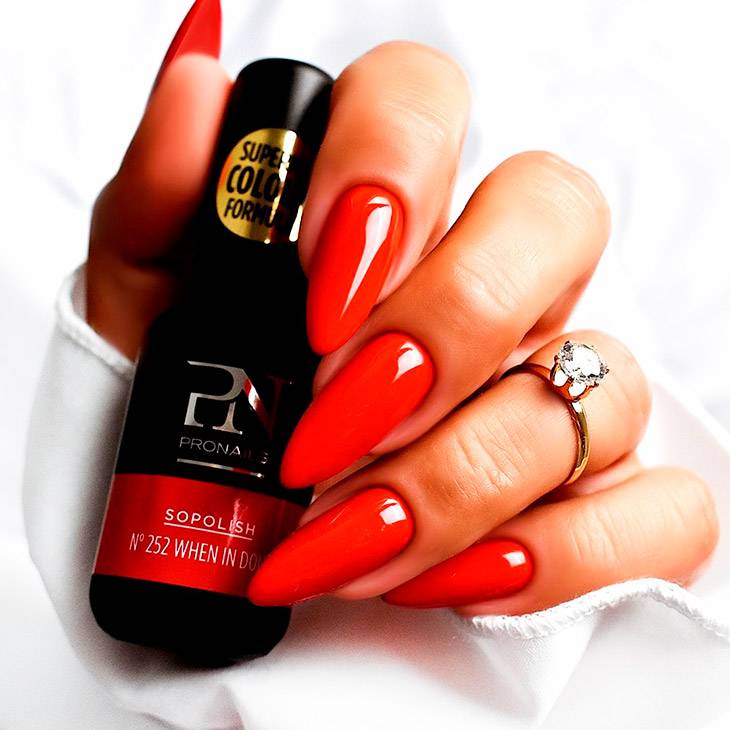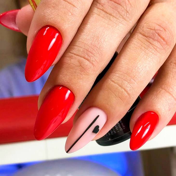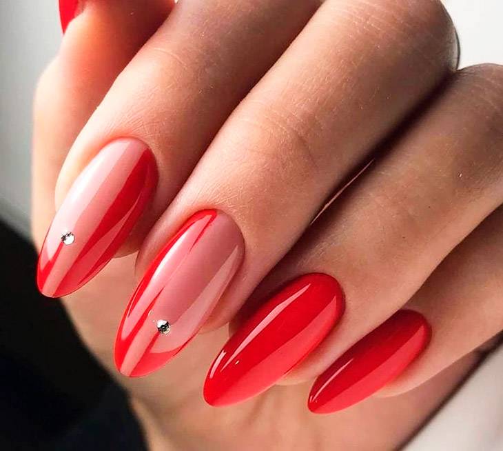На шикарных ноготках-балеринах, или пуантах, прекрасно выглядит красный, вишнёвый, бордовый лак в однотонном варианте