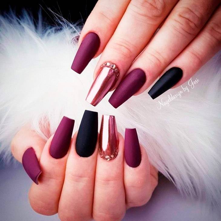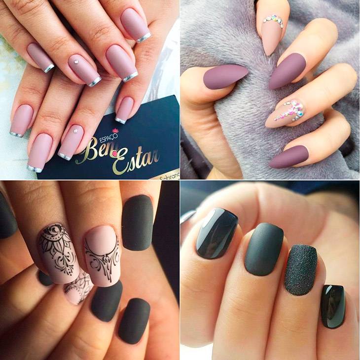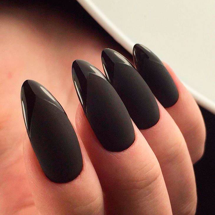 В подборке модных трендов осени для острой формы присутствуют однотонные матовые покрытия, сочетание матового и глянцевого топа, а также металлизированные лаки.