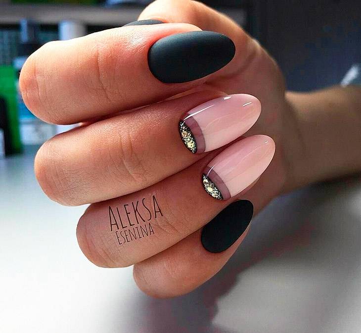 Для креативных леди интересным станет необычное оформление лунки. Она необязательно должна быть стандартной: попробуйте сделать ее, например, треугольной. Будет смотреться здорово и необычно. Также лунулу можно оформить стразами, фольгой или блестками. Такой дизайн подарит чувство праздника и наверняка поднимет настроение своей обладательнице.