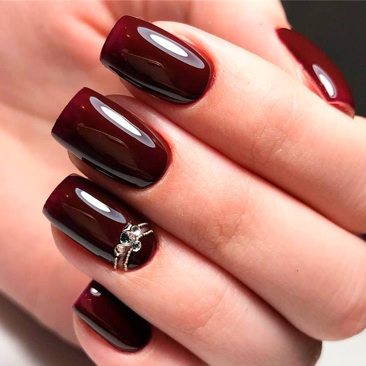 Классический маникюр для акцента на ногтях. Тёмные тона выделяют ногтевую пластину и сочетается с украшениями. Светлые и тёмные тона в одежде будут привлекательно выглядеть в дуэте с такими лаками.