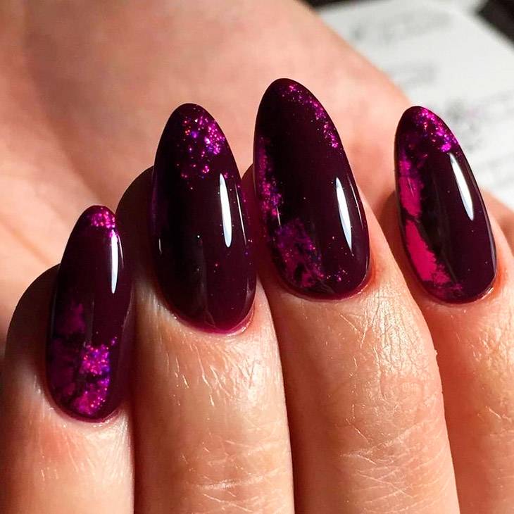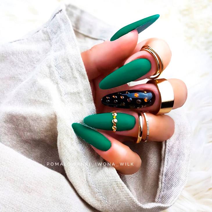 Насыщенный цвет не терпящий излишек. Самая актуальная классическая комбинация – это чёрно-зелёный или золото. В оформление маникюра лучше остановиться на френче, кошачьем глазе или небольшом количестве страз.