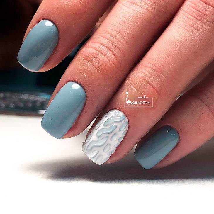 Данный вид маникюра в последнее время очень популярен. Объемные узоры, напоминающие вязку свитера, наиболее востребованы в холодное время года. Для того чтоб сделать дизайн нейл-арта необычным и интересным, нужно украсить вязкой безымянный и средний пальчик. При этом пальчики можно выделить не только при помощи ажурного рисунка, но и накрасить другим оттенком. Прежде чем наносить лак, задайте ноготкам нужную форму и избавьтесь от кутикулы. Теперь можно смело наносить базу и просушить в ультрафиолетовой лампе. Далее покрываем ноготки лаком желаемого цвета. После полного просушивания лака можно приступать к выполнению рисунка. Аккуратно выполните рисунок в виде косы или вязаного свитера (для более объемного эффекта рисунок лучше нанести несколько раз). По желанию можно покрыть узор акриловой пудрой, чтоб добиться шершавого эффекта.