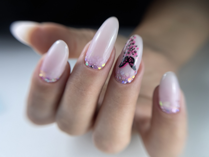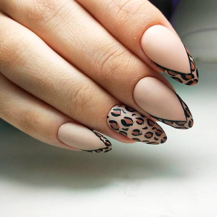 Также вы можете сочетать этот дизайн с блестками или стразами. В моду возвращается леопардовый френч, он подойдет более смелым и ярким девушкам. Более утонченно и нежно будет смотреться союз с цветочными мотивами и бабочками. Также можно попробовать поэкспериментировать с формой — в 2022 году актуален френч на миндальных и острых ногтях.