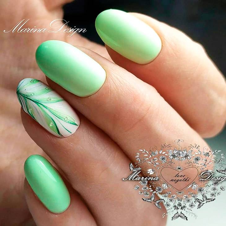 Мятный маникюр бросается в глаза, гибкий к колористике одежды. Чтобы удлинить ногти, подойдёт глянцевый топ.