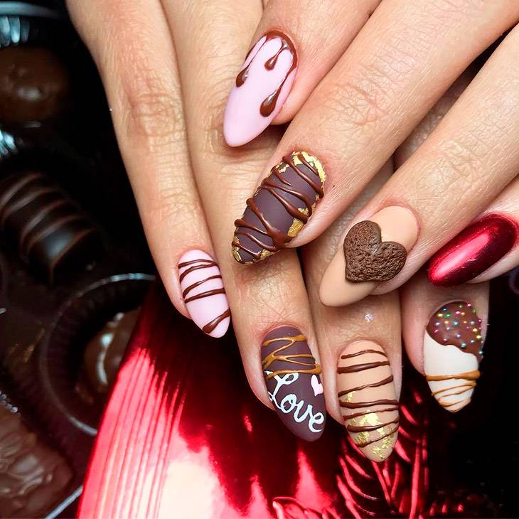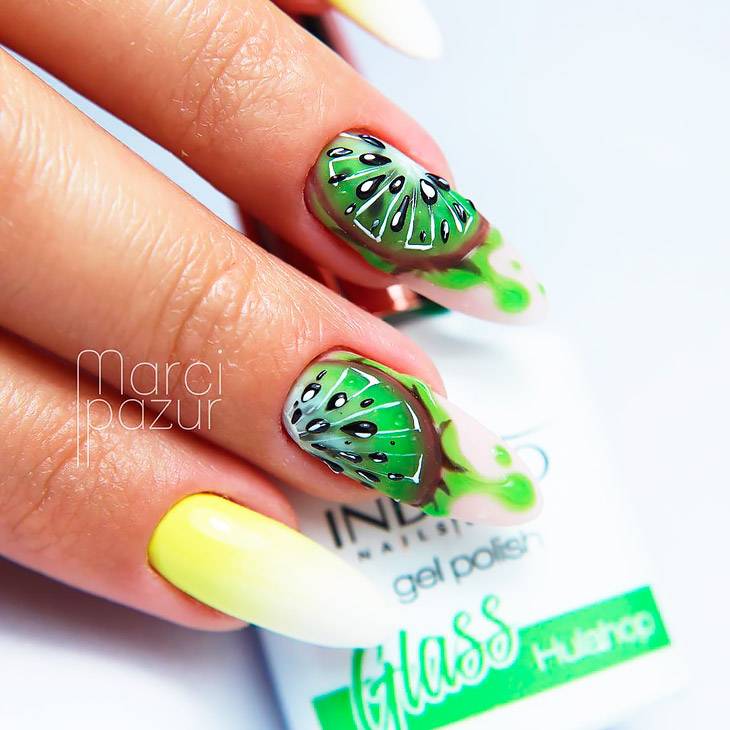 Сладкий маникюр предполагает изображение на пластине пончиков, кексов, фруктов, мороженого. Сочетаются с розовым, белым, мятным оттенками. Этот дизайн идеально подходит для летнего отдыха.