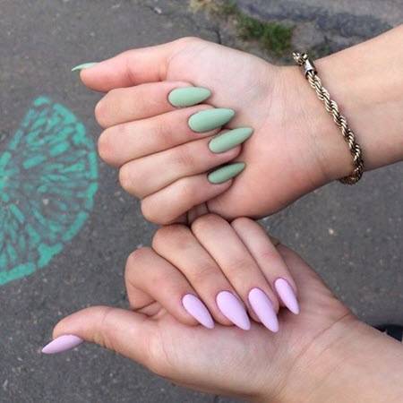 Одной из самых распространенных и любимых модницами является миндалевидная форма. Эта форма универсальна и подходит для любых типов пальцев и длины пластины. Однако, если вы активный человек и у вас длинные ногти, то такая форма не лучший вариант: легче всего ломается и не подходит людям со слабыми или ломкими ноготками.