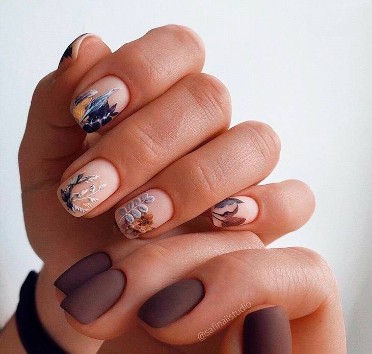 Для осени и зимы стоит подобрать тёмные оттенки лаков – хаки, шоколад, корица, кофе, синий. Чем короче ноготки, тем меньше на них должно быть декора.
