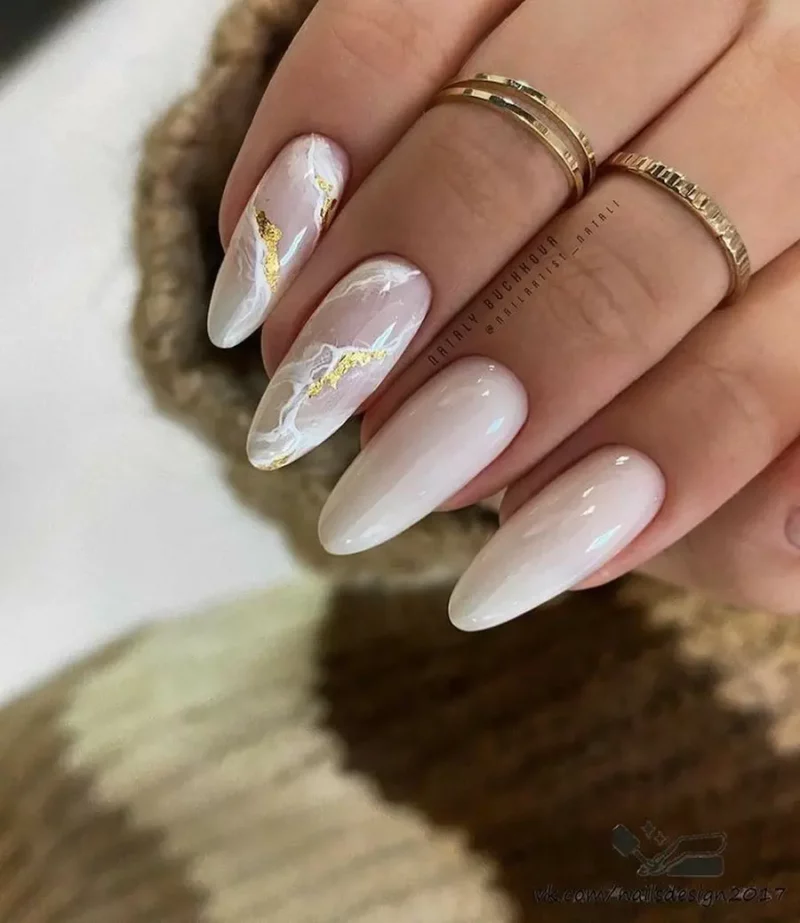 - Молочная основа или топ с дырочками — это тренд, который перекочевал с лета. Такой маникюр выглядит очень женственно и изысканно.