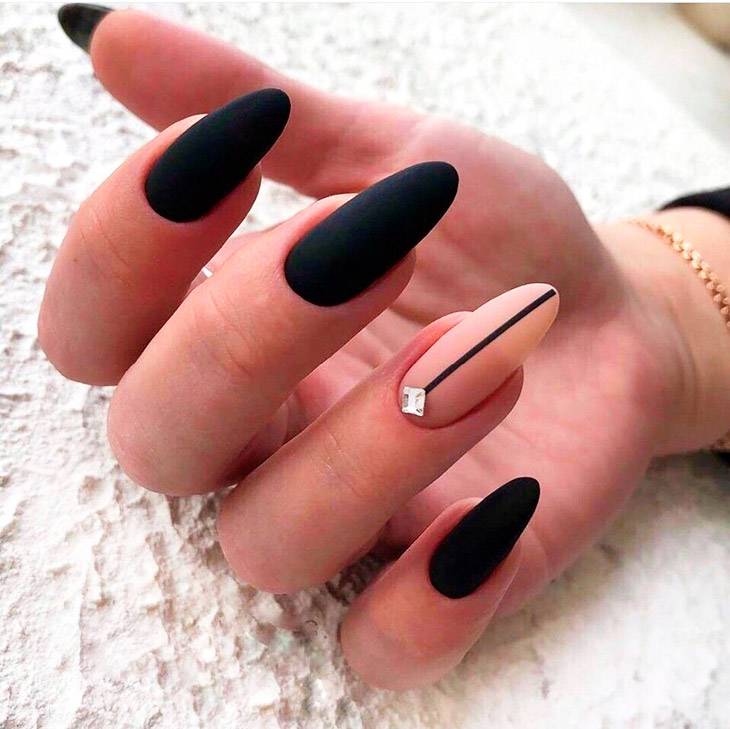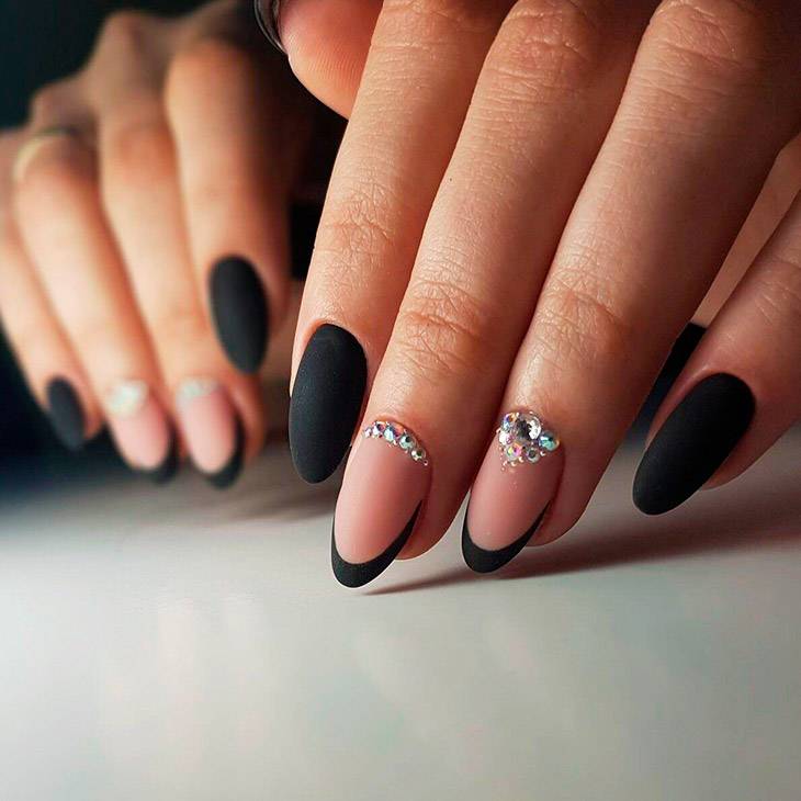 Неоспоримое достоинство черного цвета – сочетание с макияжем и одеждой. Маникюр гармонирует как в основе, так и в актуальных акцентах. На сегодняшний день дополнением будут украшения, которые разбавят его.
