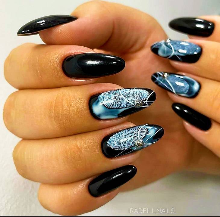 - Золотая серединка принадлежит перьями. Дизайн ногтей с этим декором может выполняться, как вручную (вам придется самостоятельно нарисовать перо акриловыми красками), так и с помощью уже готовых перьев, которые продаются в магазине. Заметим, что такой оригинальный маникюр в домашних условиях выполнить достаточно просто.